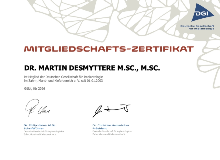 Dr. med. dent. Martin Desmyttère MSc ist Mitglied in zahlreichen Organisationen und Spezialistenverbänden rund um das Thema Master of Science in Oral Implantology.