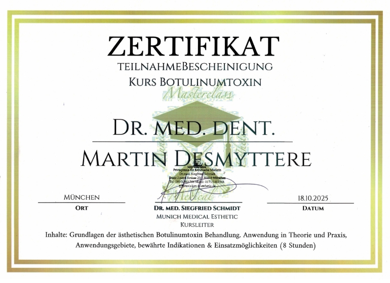Die stetige Teilnahme an nationalen und internationalen Fortbildungen und Fachveranstaltungen machen Dr. med. dent. Martin Desmyttère MSc, MSc zu einem Spezialisten für Implantate, biokompatible Materialien und Knochenrekonstruktion, sowie Kieferorthopädie mit dem Invisalign-Verfahren.